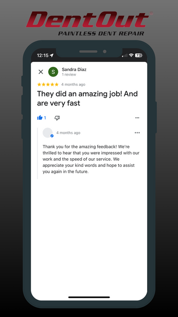 At DentOut, your satisfaction is our success. We're proud to have a long list of happy customers and we're thrilled to share some of their experiences with you. From expert hail damage repair to exceptional customer service, read firsthand accounts to see why we're quickly becoming the go-to choice for Paintless Dent Repair at a location near you.